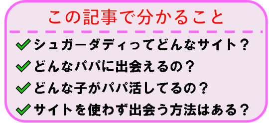 基本的には身体の関係はなしという体で進められていくことが表面的には多いですが、中には体の関係を求めてくるシュガーダディもたくさんいるので、自分の身は自分で守れるようになってから挑みましょう。