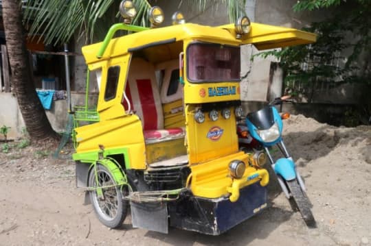 ジプニーの次に現地の人がよく利用するのがトライシクルです。バイクの横に乗れるスペースがついておりそこにぎゅうぎゅうに乗っているのをよく目にします。