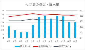 セブ島は基本的には1年中夏で暑いです。年間の平均気温は27度〜30度程あり、「南国の島」というような気候です。毎年12月〜5月が乾季で6月〜11月が雨季です。特に4月5月が暑くて、一日の最高気温が33度くらいまで上がる日があります。雨季のシーズンに入ると、2、3日に1回程度は雨が降り、多いときはほとんど毎日降る週もあります。