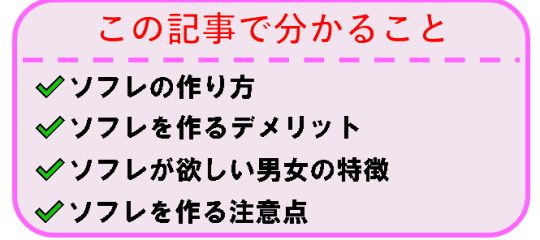 - Qソフレからカップルになる可能性はありますか?Aソフレからセフレやカップルに変わる可能性はあります。相手に気持ちを伝える勇気がない場合はソフレをあきらめて会わないことも視野に入れておきましょう。