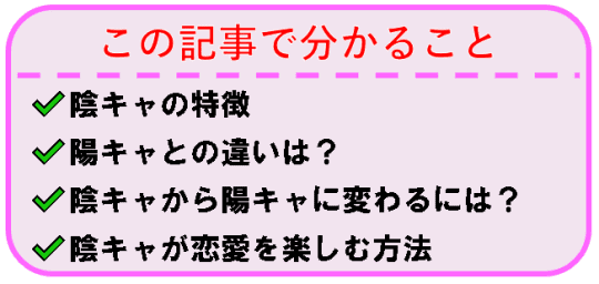 - Q陰キャラでは恋は難しいですか?恋人を作りたいので、陽キャラに頑張ってなったほうがいいですか?A「陰キャ」から無理やりキャラ変することはありません。自分と相性のいい人、自分に合った楽しみ方を知っていることが重要なので、じっくり焦らず好きな異性を観察してゆっくりアプローチしてみましょう。