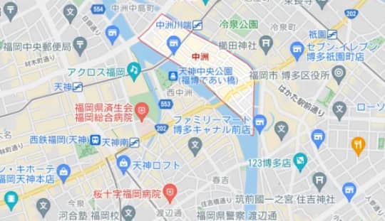 「中洲」とは、博多一の歓楽街で、那珂川(なかがわ)と福岡川の挟まれているエリアですね。