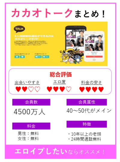 - Q出会い系で出会った子とうまく付き合うためにカカオトークは有効ですか?Aカカオトークは、出会いを探すツールではないためマッチングアプリや掲示板と組み合わせて使用するのがおすすめです。出会えた後、相手と連絡と取るためのツールとして利用すれば、プライベートで使用しているLINEなどを教える必要はありません。 面倒な相手に出会ってしまったとしてもすぐにアプリを削除できるので、トラブルに巻き込まれる危険性は減少するでしょう。