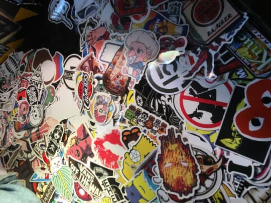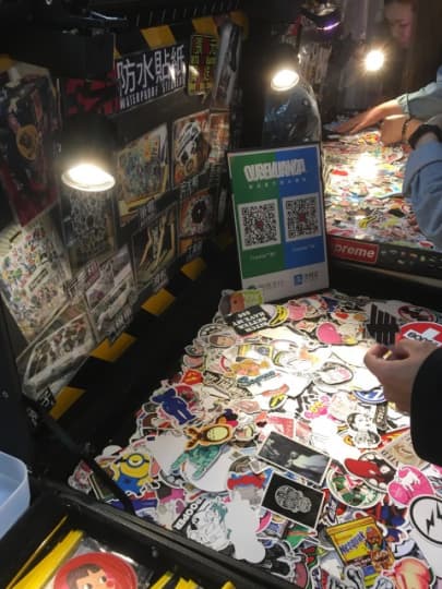 ここ一年くらい夜市でよく目にするようになったものがこれ。ステッカー! 書いてあるように防水のステッカーで、5枚でいくらというようにセットで買うと安くなる場合が多いです。