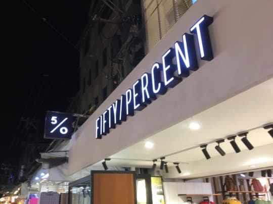 こちらのFIFTY PERCENTという服屋さんは台湾の若者に人気で、その年のトレンドの服が安く買えるお店です。 メンズ・レディースどちらもあり。