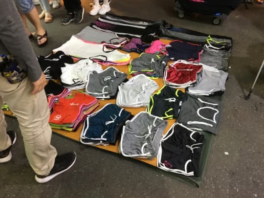 士林夜市では、お土産ではない、普段着れそうな服もたくさん売られています! 写真のようなスポーツウェアから、仕事に使えそうなアイテムまでチョイスが盛りだくさん。 そしてだいたいのものがお手頃価格です。