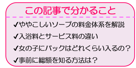 このように、ソープの料金体系には「総額表記」と「入浴料表記」の2パターンがあります。