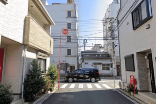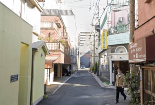 ここを三角屋根が見える建物の、左脇路地を真っすぐ突き当りまで進んでください。