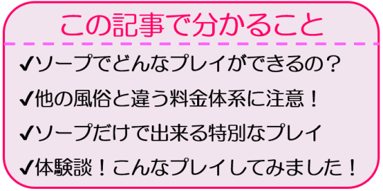 ソープランドでのサービス内容やプレイの流れ、システムなどを紹介します。ソープに行ったことのない男性、行ってみたい男性向けにその詳細と真相を元ソープ嬢の私が教えます。男性にとってソープでのプレイが楽しめるようになる記事です。