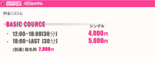 料金は時間帯によって異なり、オープン〜18時が約4,000円、18時〜21時が約5,000円、21時〜ラストが約6,000円で、40分女の子とのイチャイチャを楽しむことができます。