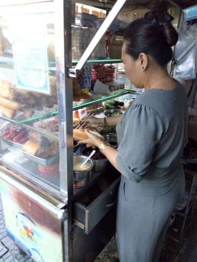 こちらがベトナムの可動式の屋台。街を歩けばすぐに見つけることができます。この屋台はバインミー専用です。(フランスパンの間に豚肉のパテと野菜やお肉が入っています)