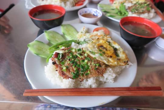 コムタムとはいわゆるクズ米を炊いたごはんのことで、その上に甘辛く味付けされた豚肉や鶏肉、野菜や卵などがのったワンプレート料理です。スープが付いてくることが多いです。