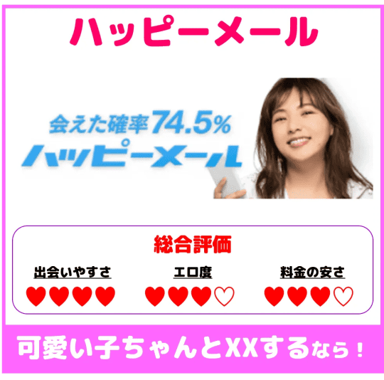 https://mobee2.jp/ad/p/r?medium=30832&ad=48955ハッピーメールは業界最大手で20年以上の老舗出会い系サイトです。