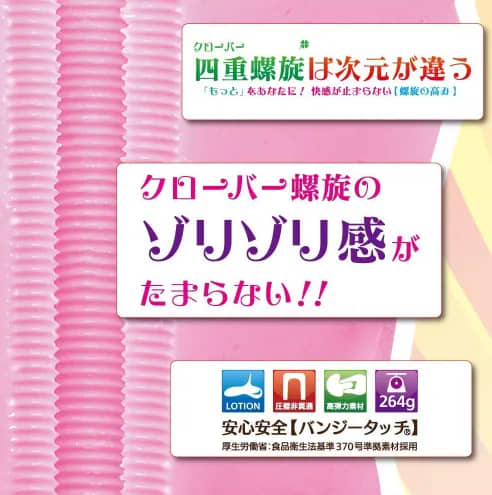 ヴァージンループの特徴の縦ヒダですが、最初は「クローバー螺旋」と言う売り込みで、内部構造がクローバーの形をしており、縦ヒダがゾリゾリとチンコに食いついてくるような快感になっています。