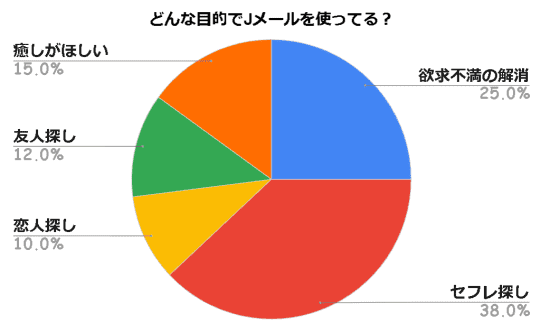 さらにJメールは、真面目な恋愛・結婚というよりストレス発散で気軽にご飯食べたい、エッチしたいというラフな関係を求めている人が多い傾向です。