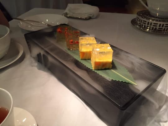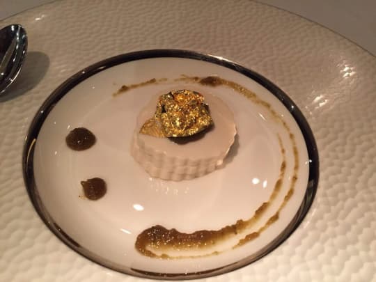 アペタイザーはこちらの...金粉がのったなにか(汗)金箔黑松露千層豆腐という名前のようですが読み方がわかりません。。 見るからに高級感がすごいです。108$=1,500円程