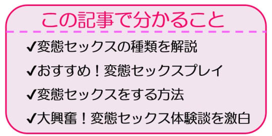 普段のセックスとは違うプレイのことを変態セックスと言い、普通のセックスに飽きた方、カップルでのマンネリ解消等にも使えるとってもいいプレイです!