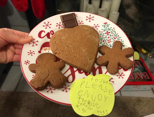 そして、いよいよ当日。たくさんの家庭にプレゼントを配るサンタさんにクッキーやミルクを置いて、メッセージを書いて眠ります。翌日クッキーがなくなっていれば、サンタさんが食べてくれた!ということです。(もちろんパパママがこっそり食べています)