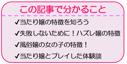 そんな経験から、少しでも満足感が得られるように、アタリの風俗嬢、ハズレの風俗嬢の特徴をそれぞれまとめてみることにしました。風俗で遊ぶ際には、是非参考にしてみて下さい!