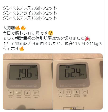 体脂肪率は元々【20%】あったそうですが、そこから減量し、今では10%代をキープしているそうです。