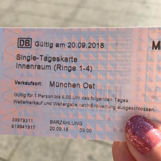 こちらが市内の一日乗車券。ドイツで日付は〈日、月、年〉の順で表示されます。 車掌さんに切符の提示を求められることもありますから、無くさないように保管しましょう。