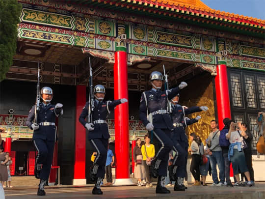 衛兵交代式三連続です。こちらは衛兵交代式1・2と比較し、最寄駅からバスまたはタクシーという点で少し行きづらいでしょうか。 ただ、1・2よりも衛兵交代式を見られる時間が長いです。入り口の門近くから出てきて、入り口から少し歩いたところにある奥の建物の前にいる衛兵さんと交代し、さらにまた入口の門まで戻ってきて門のところにいる衛兵さんとも交代。なので、二回の交代を一度で見られますし、門から建物までの200mくらい歩く姿は柵などがないのですぐ近くで見ることができます。 衛兵さんを近く長く見たい方にはおススメです。ただ忠烈祠は屋根がないので、雨の場合には屋根がある1・2をおススメします。
