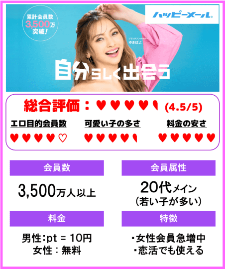 https://ac.m-ads.jp/t6d63J515a0bact6/cl/?bId=a444Ec62『ハッピーメール』は会員数がなんと3000万人!業界最大級の登録者数です!