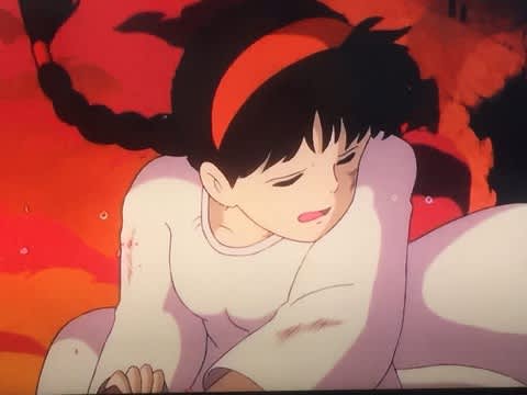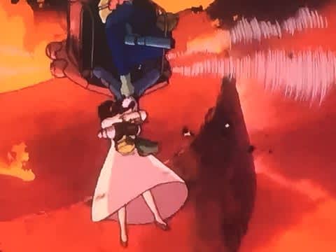 燃え盛る軍隊の要塞から、シータをかっさらうパズーの逆さハグです。