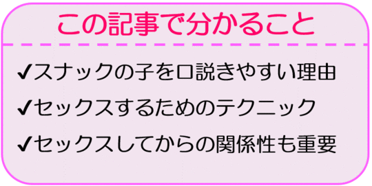 皆さんスナックに行かれたことありますか?今回はそんなスナックでお気に入りの女の子と口説いてセックスまで持ち込む方法をご紹介していきます。紹介した方法を実践すればあなたも、お気に入りのスナックの女の子とセックスまで持ち込めますよ!