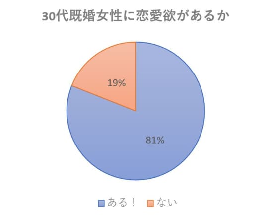 30代の既婚女性1,000人にアンケートを行った調査によると、なんと驚きの8割くらいが「恋愛欲がある」と答えたそうです!