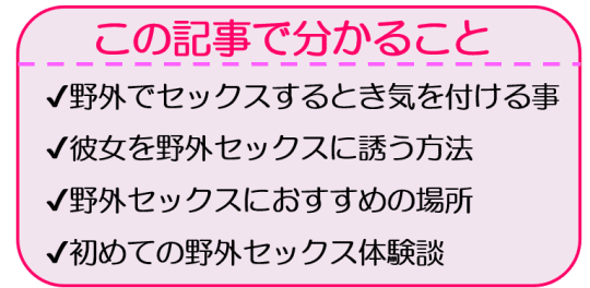野外セックスはすごく興奮するし楽しいですよ!野外でのセックス初心者さんのために、おすすめの場所や彼女の誘い方を細かく伝授していきますね。