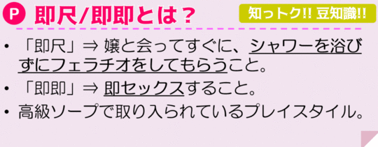 即尺ってご存じですか?本来は高級ソープで行われるサービスのひとつなんですが、最近はお手ごろ価格のソープやヘルスなんかでも提供されています。即尺サービスがあるとないとじゃ、遊び方に大きな差が出てきます。即尺プレイの楽しみ方や注意点を説明します。