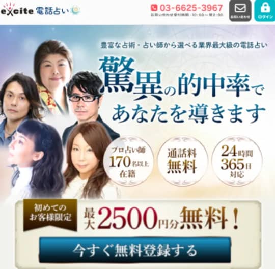 業界最大手の電話占いが「excite電話占い」です!占いランキングの常連の占い館で、所属している占い師は一度は名前の聞いたことがあるカリスマ占い師ばかり!