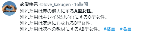 そして何十人と付き合ってきたのに、いなかったのがB型です。これは今気づきました。これからB型の人にフォーカスを置いてみようよ思います(笑)