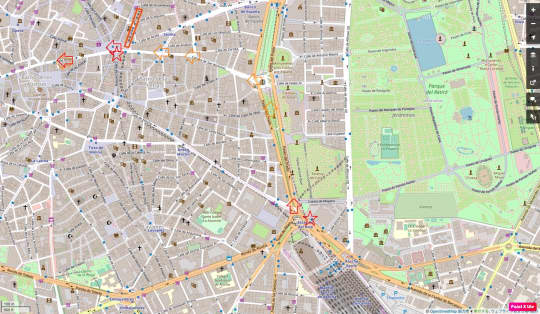 下部の赤い☆印がアトーチャ駅です。アトーチャ駅からソル、マジョールへパセオ・デ・プラド(プラド遊歩道)を通ってソル、マヨールへ行く道を黄色い矢印でマーキングしています。
