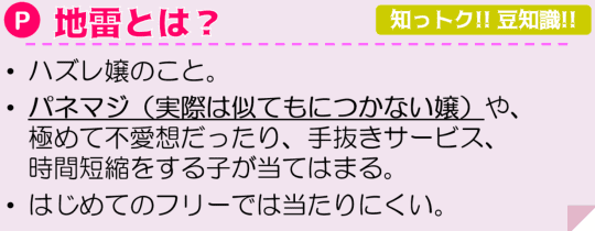 なのでもちろん接客も地雷です。そんなお店、女の子にあたってしまうと、帰りたくなっちゃいますね。