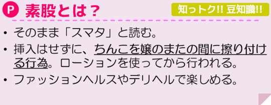 「素股」なんてやったことない子が多いと思いますが、「研修」といってお店の男性スタッフ相手に練習させてもらえるお店もありますので心配しなくても大丈夫です(研修が必須のお店もあります)