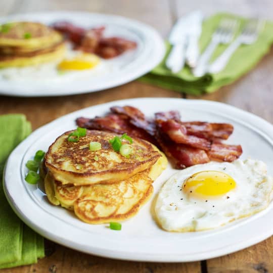 スイーツとして食べるパンケーキよりも、所謂おかず系パンケーキのような感じで、朝食にベーコンやソーセージなどと一緒に食べられています。