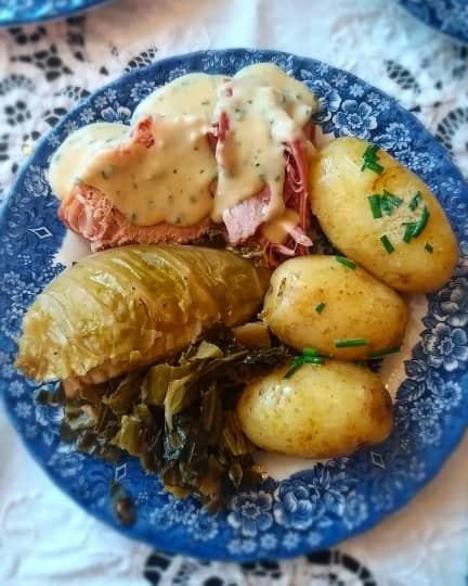 家庭では大きな塊で買ってきたハム用の肉を鍋で茹でて手作りする、シンプルですが手間のかかる郷土料理です。ハムと一緒にはじゃがいも、キャベツ、人参、ブロッコリーなどの温野菜が食べられます。