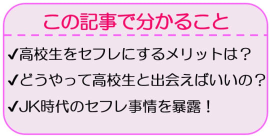 ピッチピチで初々しいJKのセフレを作れたら夢みたいですよね?そんな願望を持っているなら、私が叶える方法を教えます!高校生時代にセフレとヤリまくっていたビッチな私だから分かる、高校生をセフレにするやり方や注意すべき点を伝授しちゃいます。