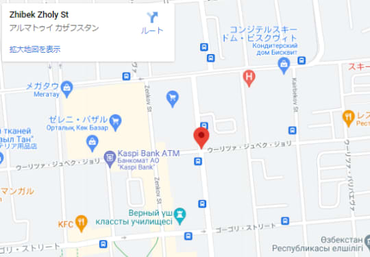 最寄り停留所は「Zhibek Zholy St」で、5・5A・5B・17・21・22・29・29R・42・60・65・71・111・117・121・141路線バスに乗るとすぐに着きます。