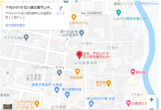 石川県金沢市から車で1時間ほどの所にある加賀市の山中温泉は渓谷沿いに旅館が立ち並ぶ景色がきれいなところで旅館やホテルなど26件の宿泊施設が存在し、温泉街としてにぎわっている場所です。