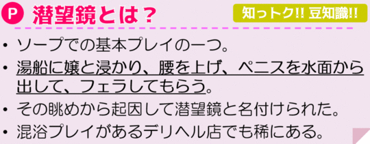 ただ、一緒に入るのではなく、お客様が水面におちんちんだけを出すのでフェラをしてあげる「潜望鏡」をします。