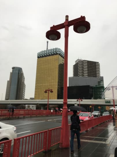 この構図が取れる場所は、吾妻橋です。浅草駅からすぐ近くの場所です。観光の始まりに撮るなら午前中のすっきりとした写真が、観光の終わりなら夕刻の情緒あふれる写真が取れます。