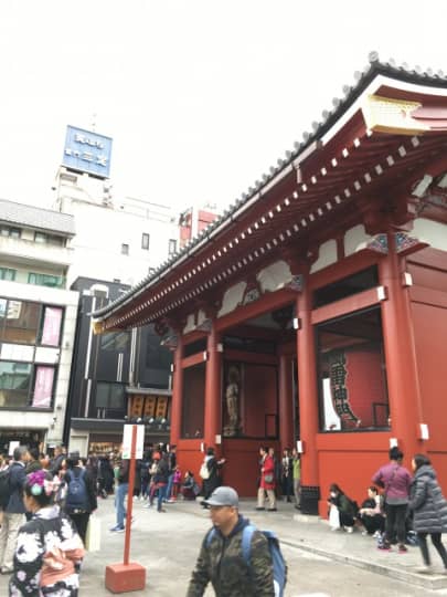 仲見世通りを通り過ぎると浅草寺宝蔵門に到着します。宝蔵門は赤と緑のコントラストがとても美しい建物です。