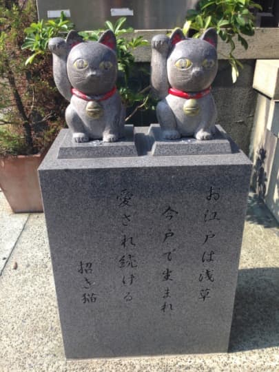 最初に向かうのは今戸神社です。今戸神社は「招き猫発祥の地」として有名な神社です。昔の隅田川からは良い粘土が良く取れて、それを使って招き猫を作ったそうです。今戸神社の狛犬は「招き狛犬」として片足が挙がっています。ちなみに蚊取り線香の豚の容器も、昔は隅田川から取れた粘土で作られていました。