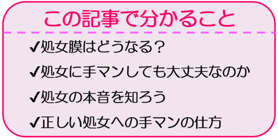 - Q処女の子に手マンってしても大丈夫?A処女でも手マンはしても大丈夫です。ただ、処女・非処女関係なく爪をきったり、指を挿入されても大丈夫かなどの確認は行いましょう。