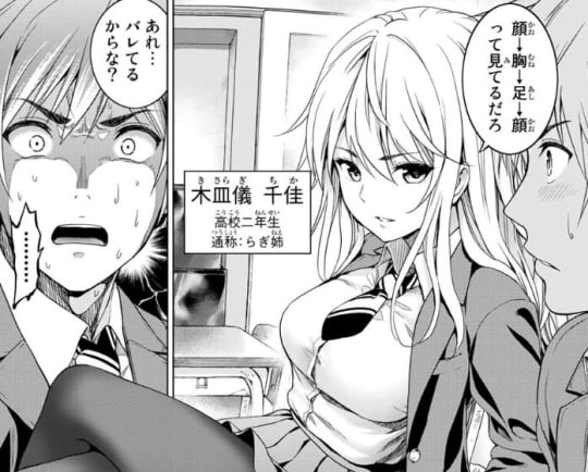 同じ高校の友人で『天宮晴輝』に想いを寄せている『木皿儀千佳』に「女子と話す時に顔→胸→足→顔と見ている」とバレてしまいました。