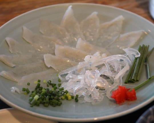 一年にそうそう何度も食べられない、高価なふぐ料理は、私はお刺身で味わう『てっさ』が一番好きです。ゴリゴリの歯ごたえをすだちの香りと共に味わうのは、最高の至福の時間ですよ!