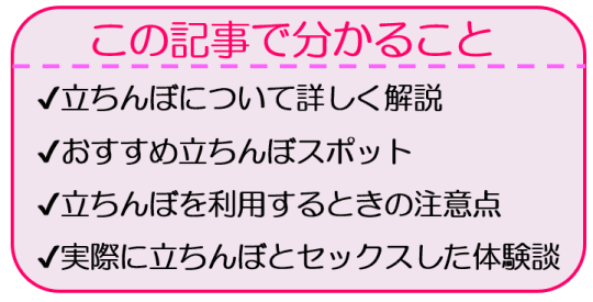 また、立ちんぼをしている女性は『とにかく稼ぎたい』と考えている女性も多いため、ホテルなどに行かず野外でプレイをしてくれる場合も。